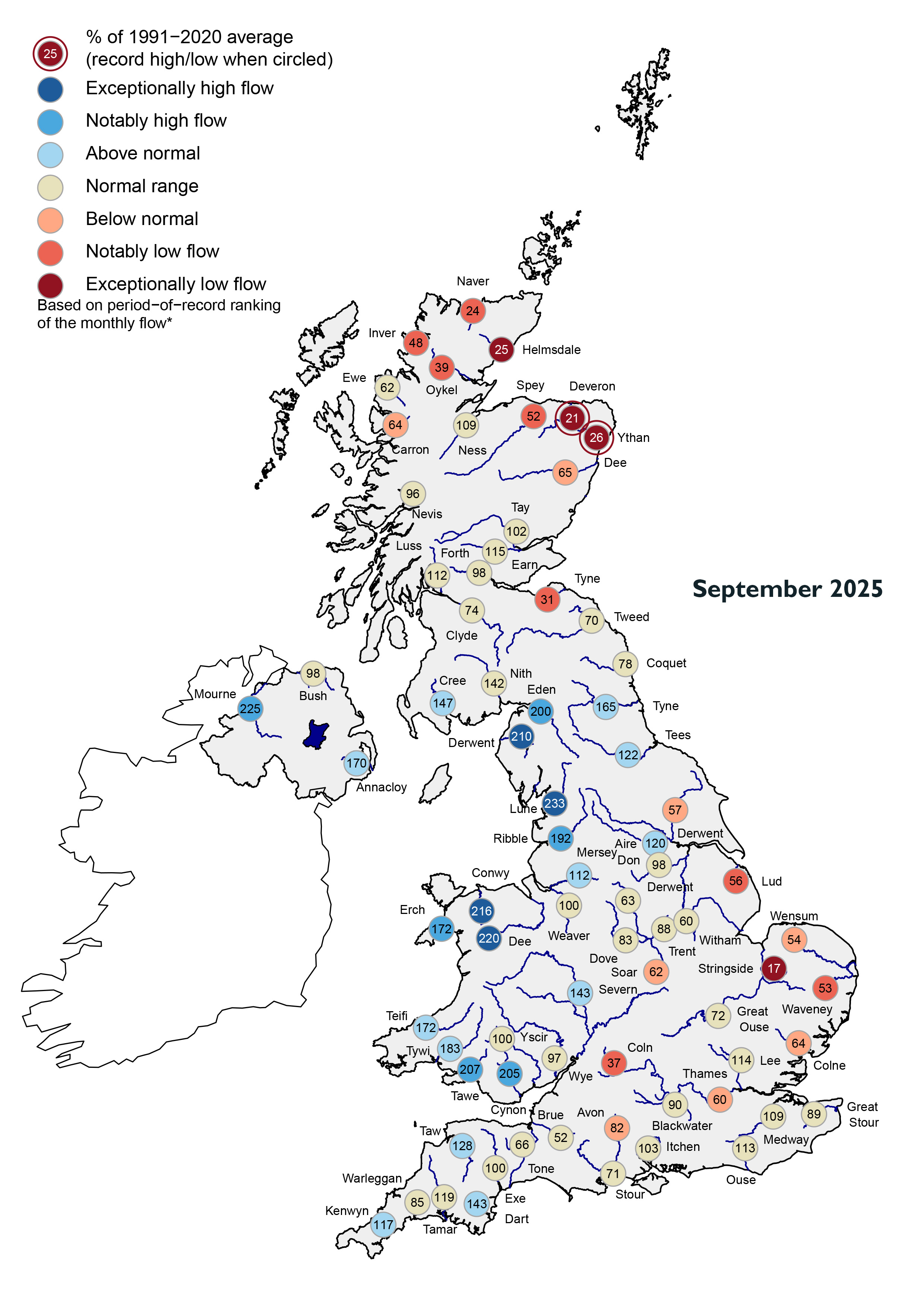 In comparison to the summer months, September was wetter with temperatures nearer average. Rainfall was 132% of average for the UK, with most regions above average. River flows were above normal to exceptionally high in Northern Ireland, Wales and northern and south-west England, whilst below normal to exceptionally low flows were seen in northern and eastern Scotland and south-eastern England. Though soils wetted in all regions, COSMOS-UK sites in south-east England remained drier than normal at month-end. Groundwater levels generally remained below normal across the UK and continued to decline apart from western boreholes where some localised recharge was observed. In most impoundments, stocks rose relative to average and in some cases, stocks increased to above average by month-end (notably so at Northern Command Zone, Daer, Silent Valley). However, reservoirs from north-east Scotland to southern England remained below average at month-end – some substantially so, including East Lothian (its lowest for September in a series from 1988). Despite recent wetter conditions, the impacts of the dry spring/summer persist, with sustained rainfall still needed to fully recover the deficits that have built up since the start of the year. At the end of September, five Environment Agency areas remained in drought and seven catchments in north-east Scotland remained at significant water scarcity, whilst by the 26th, all areas in Wales were in recovery from drought/prolonged dry weather. The Hydrological Outlook over the next three months suggests a continuation of normal to below normal flows and groundwater levels in eastern Scotland and the south and east of England, whilst elsewhere they are likely to be normal to above normal.